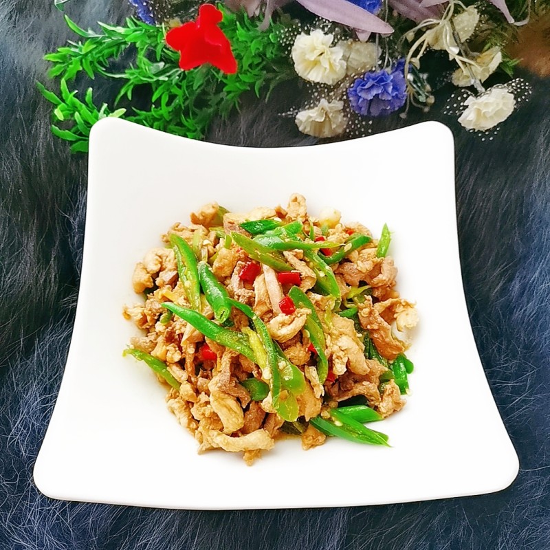 5:锅烧热放少许油,倒入鸡胸肉丝,翻炒几下,再倒入青椒炒香,加少许盐和生抽调味,翻炒片刻即可。