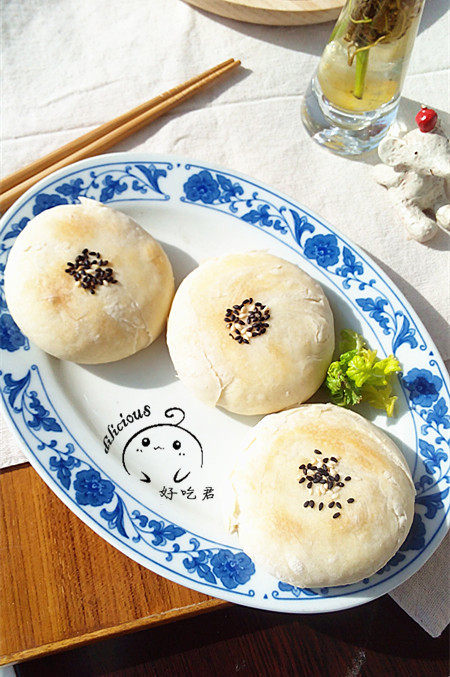 3:将包好的饼放入平底锅或者电饼铛,先小火定型,两面定型后,开中小火,让饼上色,烙到两面金黄就可以出锅