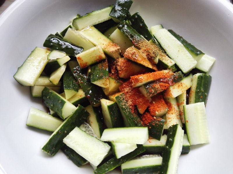 5:黄瓜切条后加入适量盐拌匀备用。