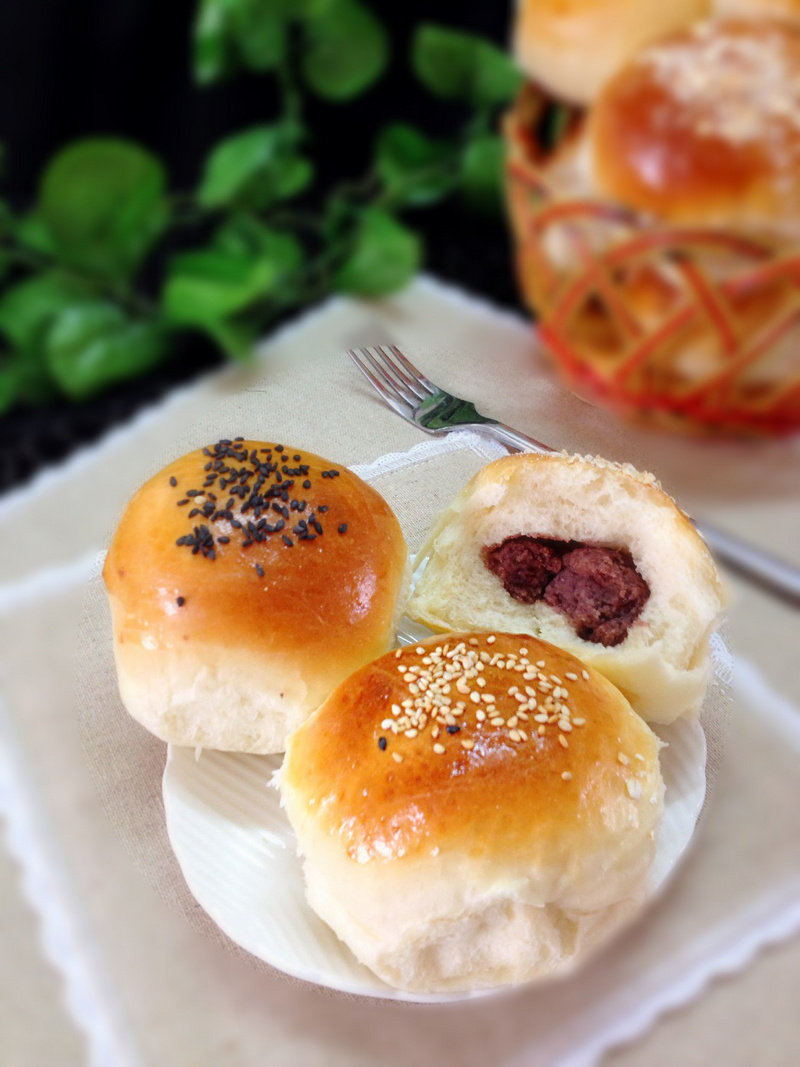 黄油10克;盐2克;糖20克;蛋液10克;豆沙馅80克;紫薯馅80克;肉松80克;黑白芝麻适量;燕麦片适量;