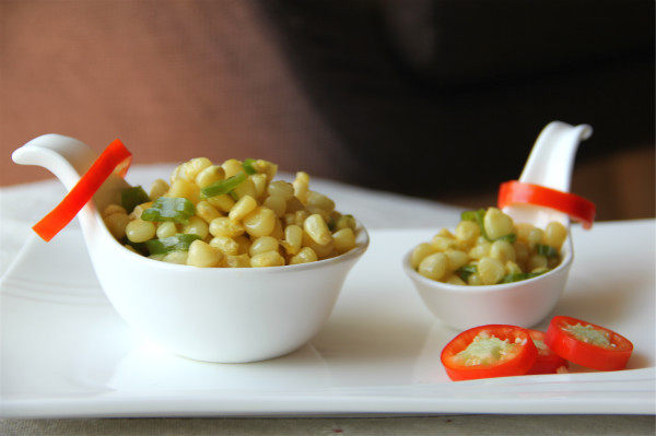 2:玉米剥粒,洗尽,控水,青辣椒切碎,