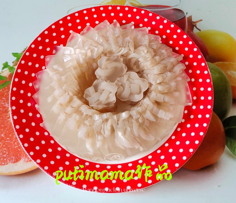 11:将皮冻摆成圆型,再日将皮冻扣出3个花型皮冻放置盘子中间点缀即可。。