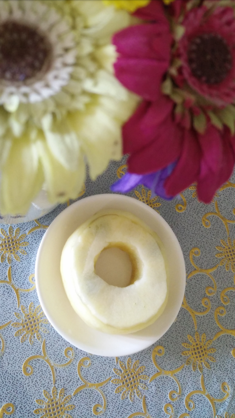 2:【刀功】削苹果,削成图中所示形状。一片作底,再削一片作盖,大小盖。展现刀功技术的时候到了!此时,亮出黑暗料理刀——“三点式金刚麻花”,钻圆孔,小孔不能穿底。这个月饼灵感来自于藕。当然,也可用藕或面粉做。然而用苹果作皮,才叫大胆创新。说实话,刀功一塌糊涂,皮削得太厚了,圆孔也少了几个,像个煤饼。最好是能削得越纤瘦越好。