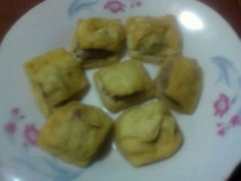 1:猪肉、葱白、葱叶、青辣椒剁碎,豆腐泡横切