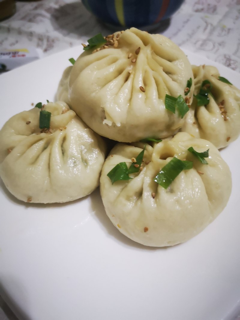 9:直到水分吸收干这时包子也熟了撒上葱花