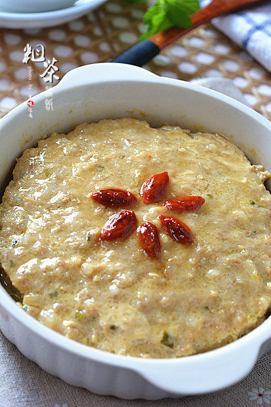 5:肉馅搅拌均匀后放入耐高温容器内,将肉馅铺平并放入洗净后的枸杞作为点缀,放入蒸锅中,上气后中火蒸制20-25分钟