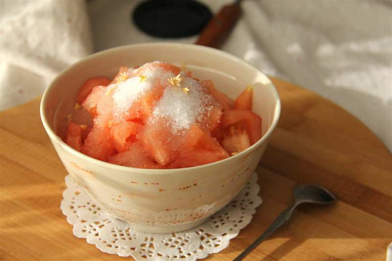 2:在番茄上撒上绵白糖,等糖化开就可食用了