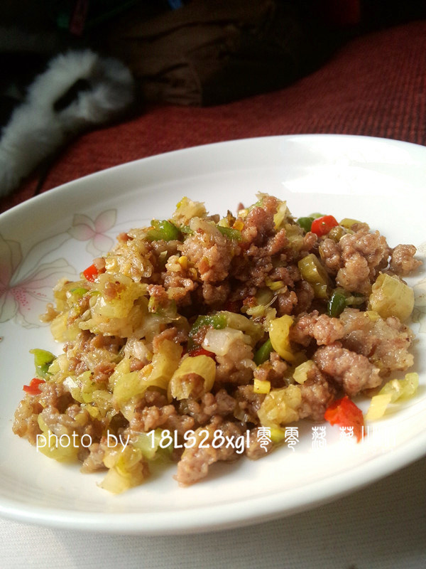 7:肉末同泡椒、小米辣等翻炒均匀;
