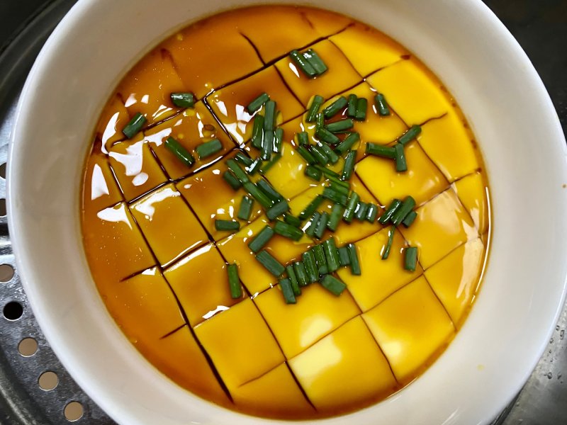 8:到时间后打开盖子,好鲜嫩的鸡蛋羹,淋上一勺轻盐原汁酱油就可以吃了,喜欢香油的可以放一丢丢香味提味。