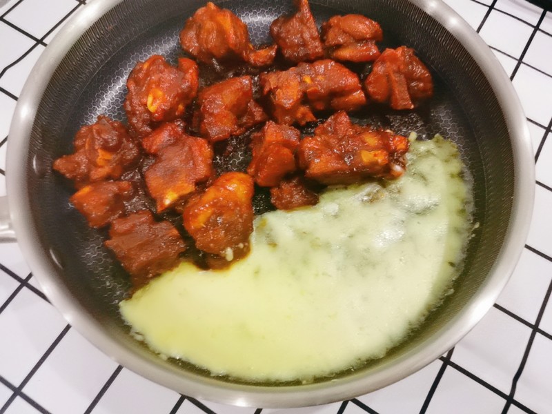 7:另取一平底锅,一侧铺排骨另一侧放芝士,开小火加热。