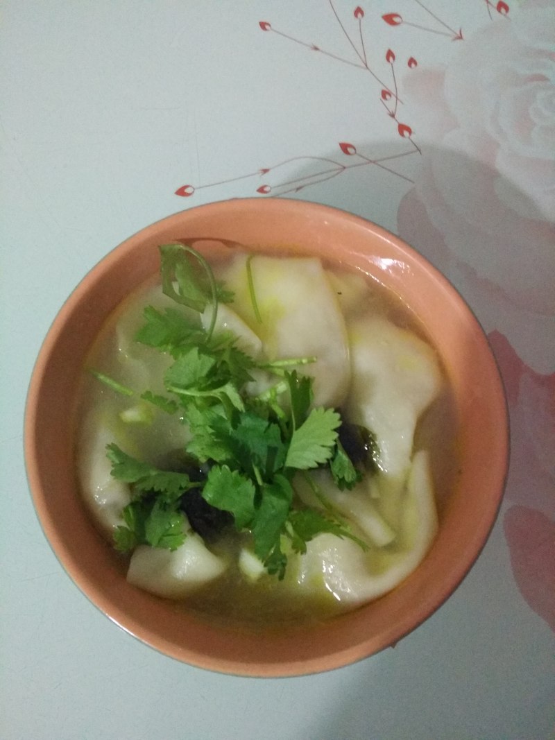 14:盛入馄饨和汤,撒上香菜,美味就可上桌了