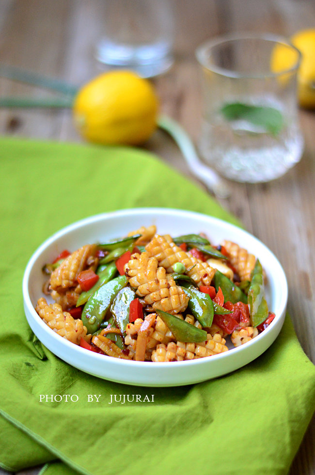 鱿鱼1条;荷兰豆80g;红甜椒2/1个;