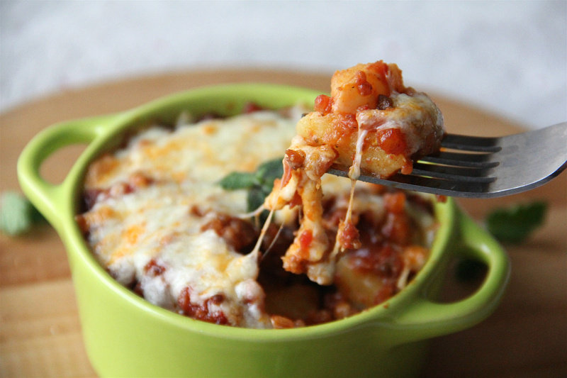 8:把炒好的番茄肉酱铺放在土豆上,再放上马苏里拉芝士,放入预热210℃的烤箱上层7min左右,表面芝士融化并且微微金黄即可,