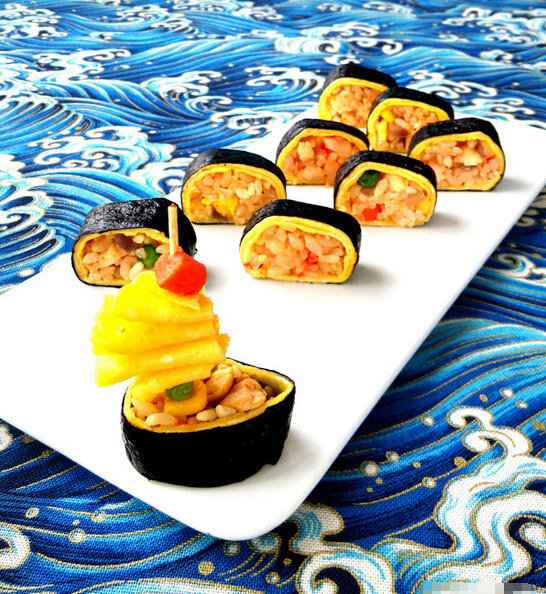 11:卷的时候把米饭压实,切的时候就不会散。卷的时候要均匀用力,否则容易弄破蛋饼