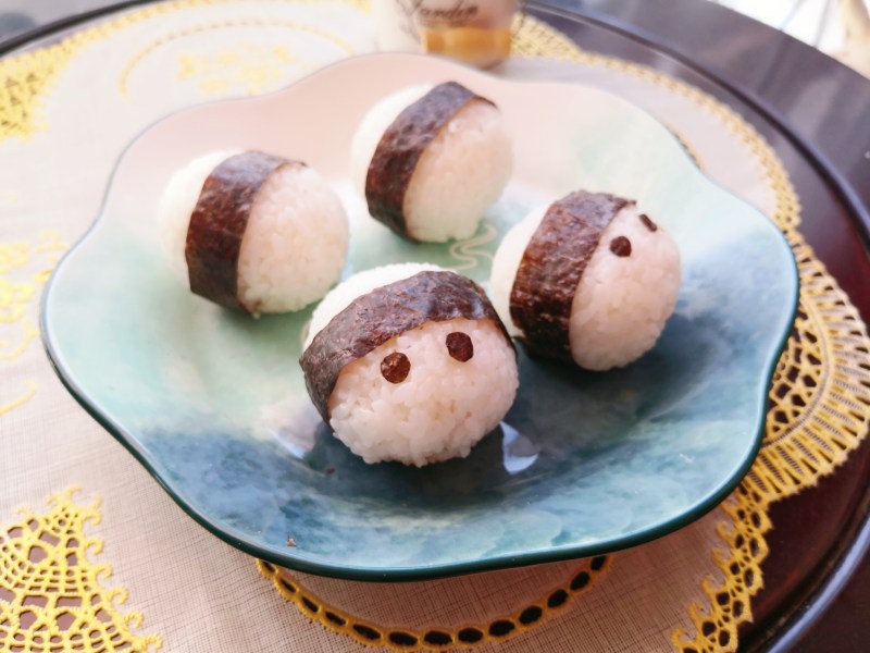 7:海苔纵向剪开成两片,贴在饭团表面即可。
