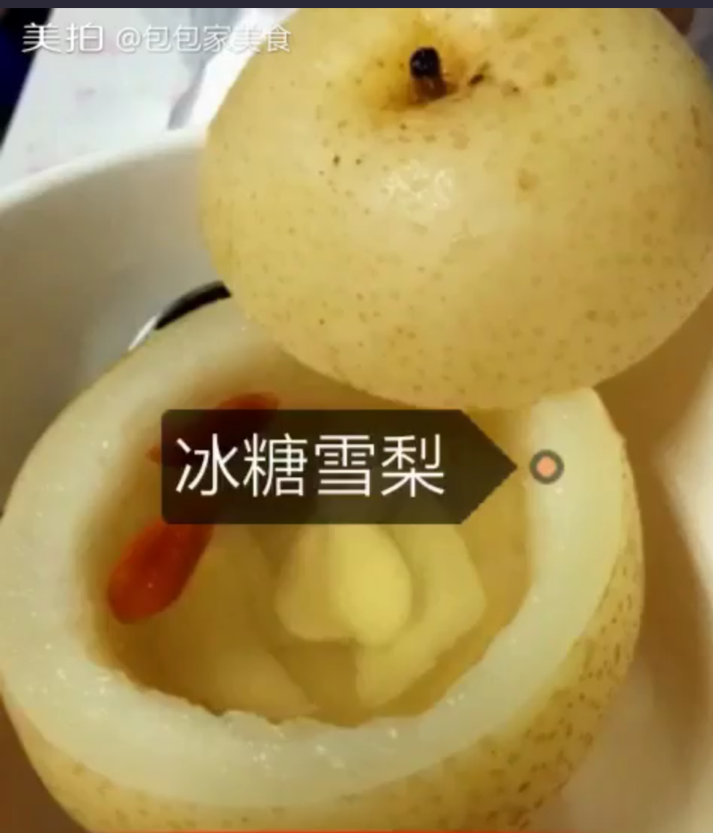 4:大火煮开,然后放入冰糖一捧,小火炖煮20分钟,过程中注意多次反转梨身,搅拌,是冰糖快速融化。盛出放一晚,第二天食用即可。