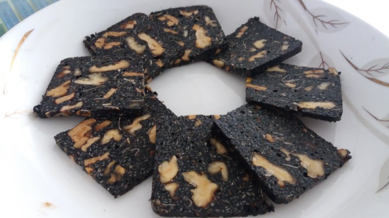 黑芝麻500克;云南野生纸皮核桃500克;新疆灰枣200克;宁夏枸杞100克;黄酒2000ml;黄冰糖适量;