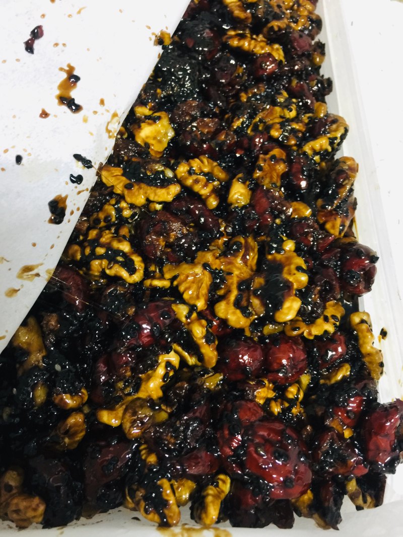 6:熬制好的阿胶,用勺子舀起成旗状,依次加入核桃红枣枸杞黑芝麻依次搅拌。忘了拍照。