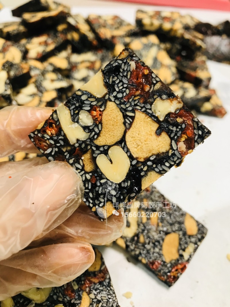 阿胶250g;核桃250g;黑芝麻250g;红枣100g;杞子50g;