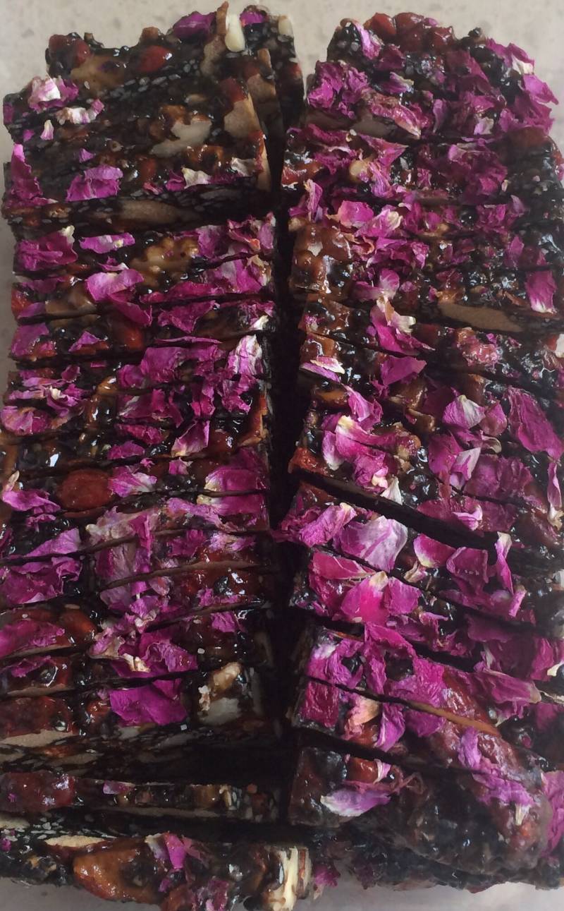 7:搅拌好的阿胶糕放入模具,模具提前放上保鲜膜并刷上油,底部铺上玫瑰花瓣,把阿胶膏压平,顶部再铺上玫瑰花瓣。