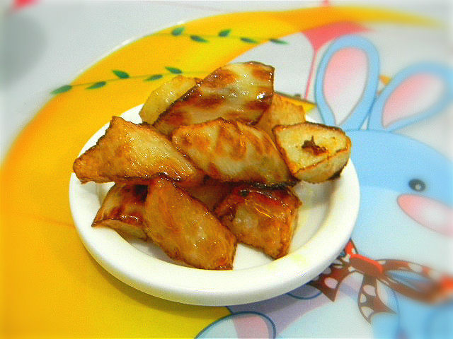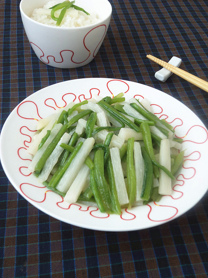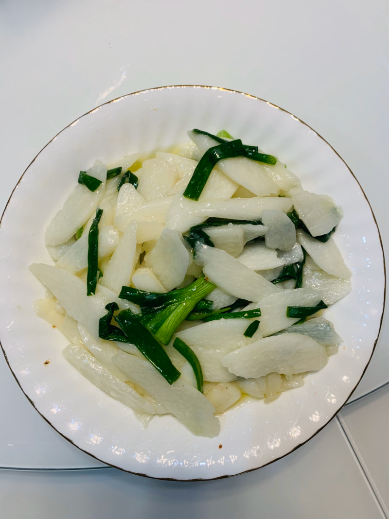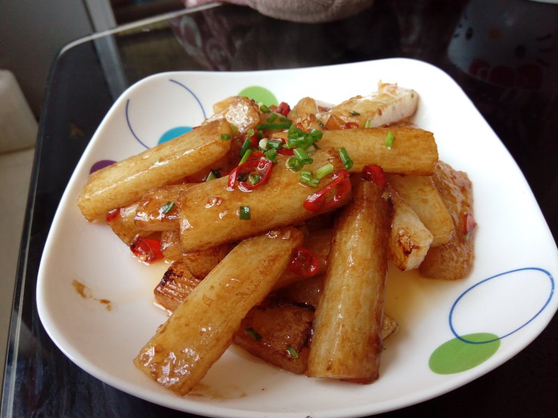 5:热锅热油,放葱花,在放山药,微炒,关火放盐,糖,起锅装盘即可