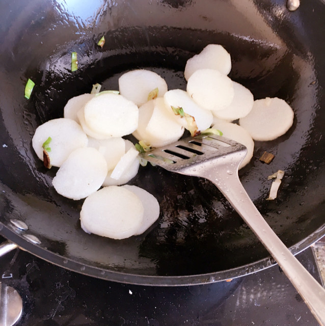 6:起油锅,葱姜入锅煸香后山药入锅炒。