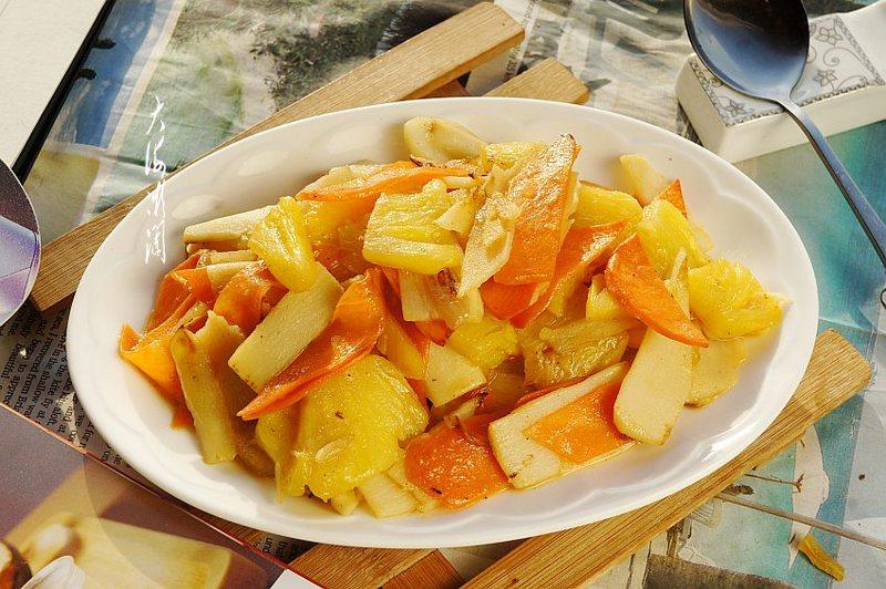 2:2.菠萝淡盐水浸泡10分钟反复冲洗后切片,山药、胡萝卜去皮洗净切片,山药片用冷水浸泡至炒前