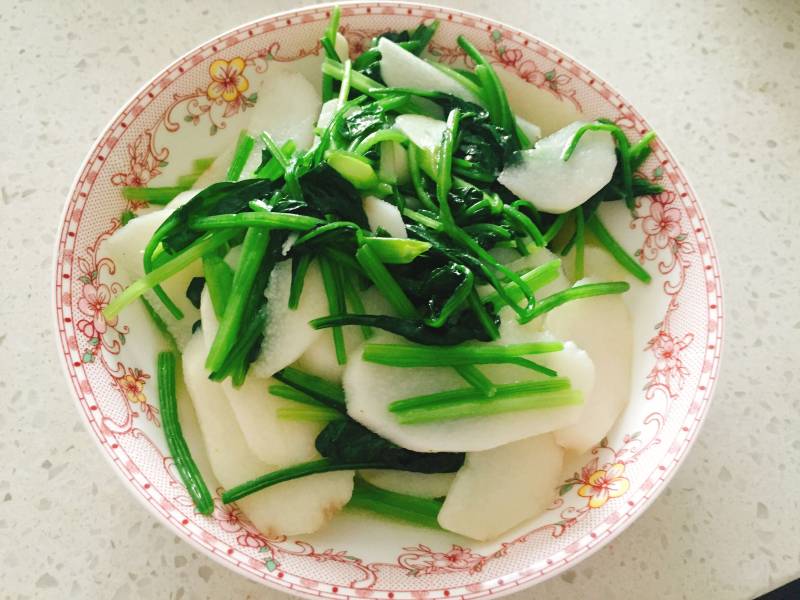 4:加入焯水的山药和菠菜一起翻炒,加入盐,鸡精调味,翻炒均匀就可以出锅啦,很清淡的一道菜