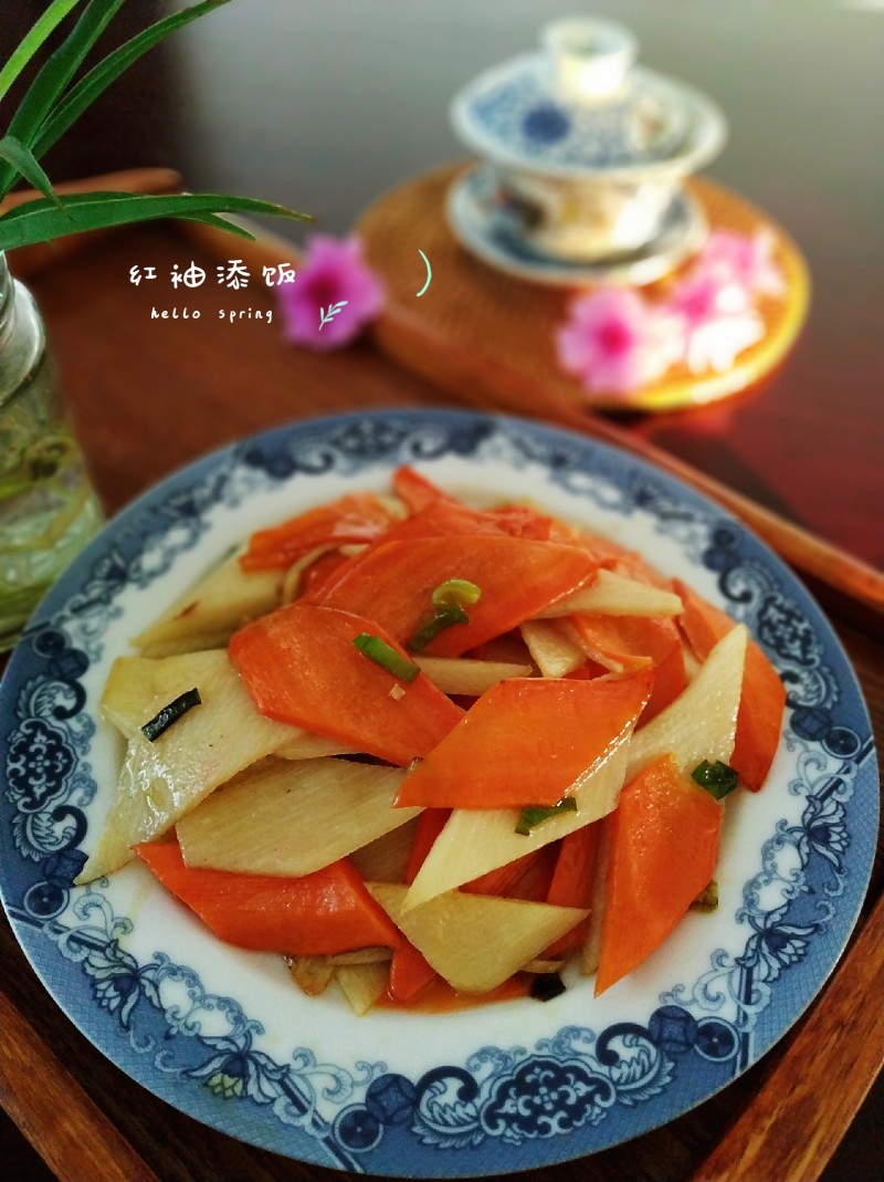 1:一根胡萝卜,半块山药,切山药最好戴橡皮手套,粘液沾手上发痒。切好后放水里防氧化。