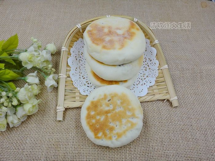 7:收口向下,用手稍微按几下,把面团按大一些,按成面饼。然后把饼坯放平底饼里,小火煎两分钟左右翻面,另一面也煎定型后可以撒入少许水,盖上盖子,利用水蒸汽把饼焖熟,焖熟后把两面煎至微黄就可以出锅食用。