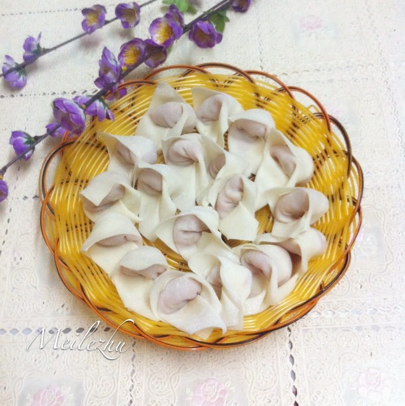 5:把馅放入擀好的云吞皮中,收紧口即可;