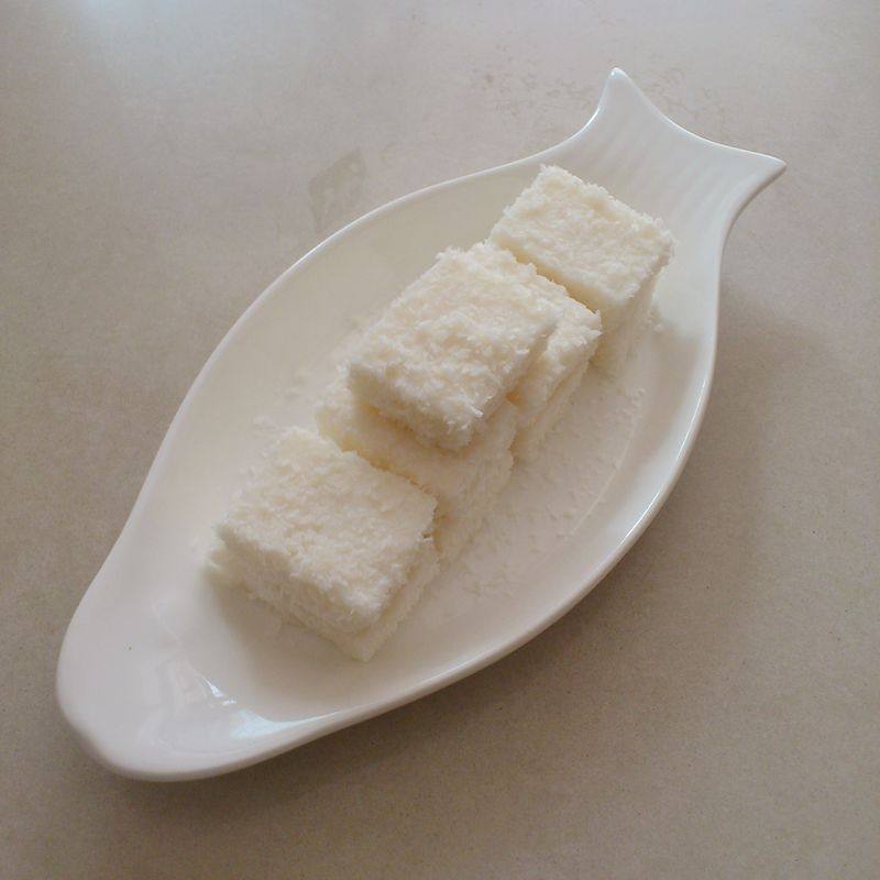 3:7.盖上盖子在冰箱冷藏一夜8.第二天打开盖子后先用小刀在容器四壁轻轻的刮一下,然后倒扣在案板上,切成小块,四周全部扑上椰蓉,开始享用吧!