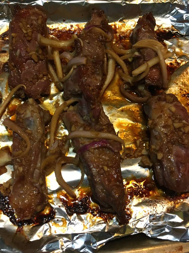 6:20分钟后,再涂一次酱汁,然后将蜜糖均匀涂抹在肋排上,将洋葱放在肋排上,继续放入烤箱,210度,15分钟。