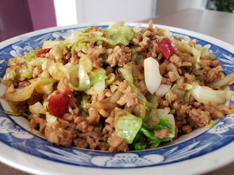 6:锅烧热放少许油,倒入肉末加少许盐和老抽上色,快速煸炒,再倒入蒜和辣椒炒香,继续倒入包菜丝加少许盐和五香粉调味,翻炒几下即可。