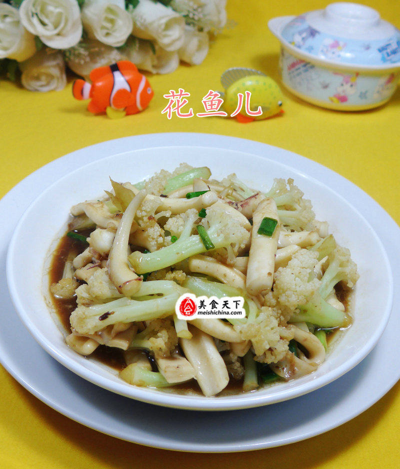 10:鱿鱼差不多熟的时候加入菜花翻炒,加上适量盐调味。3分钟后可以起锅了