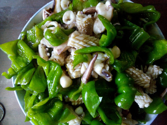 9:干锅热油,放入姜丝蒜片,炒出香味后放青椒,炒半分钟后放入鱿鱼。翻炒1分钟后,沿锅边倒入调好的芡汁。翻炒5秒,即可出锅。