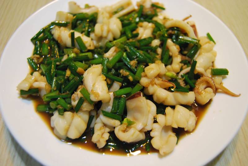 2:鱿鱼清理干净后切片,韭菜花切段待用!