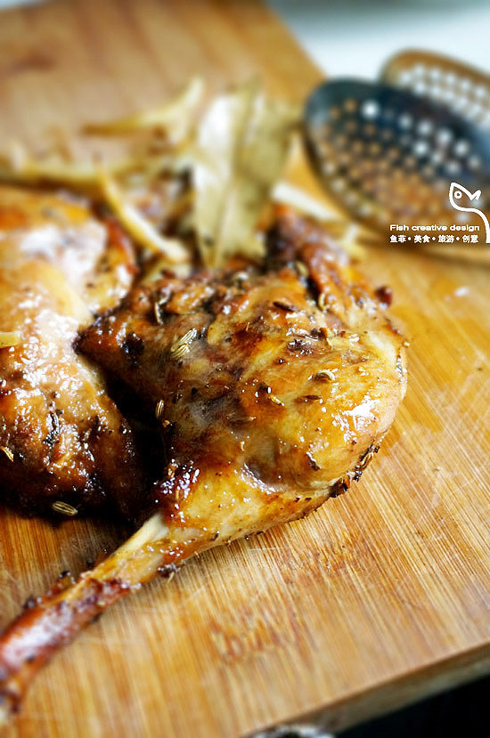 10:刚取出来的鸡腿用牙签扎几下,鸡腿内部多余的油脂就会流出来,去掉烤叉,我们的鸡腿就可以开吃咯。