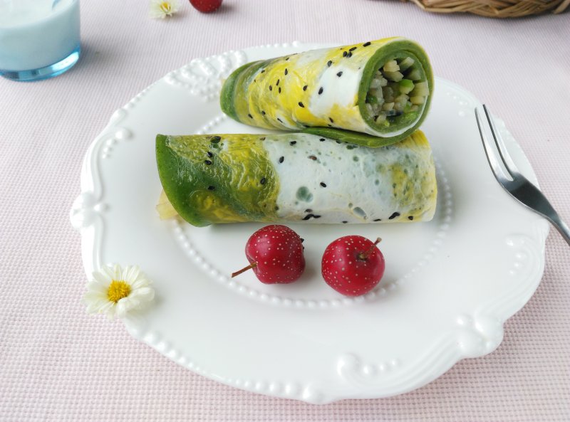 11:翻面,将土豆丝铺在菠菜饼上,卷起来。