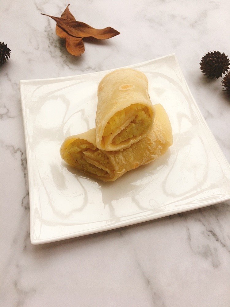 6:平底锅刷油,倒入适量面糊摊圆,煎至两面金黄后卷入土豆丝即可,当然啦,这个饼什么都可以卷的,丰俭由人哦.