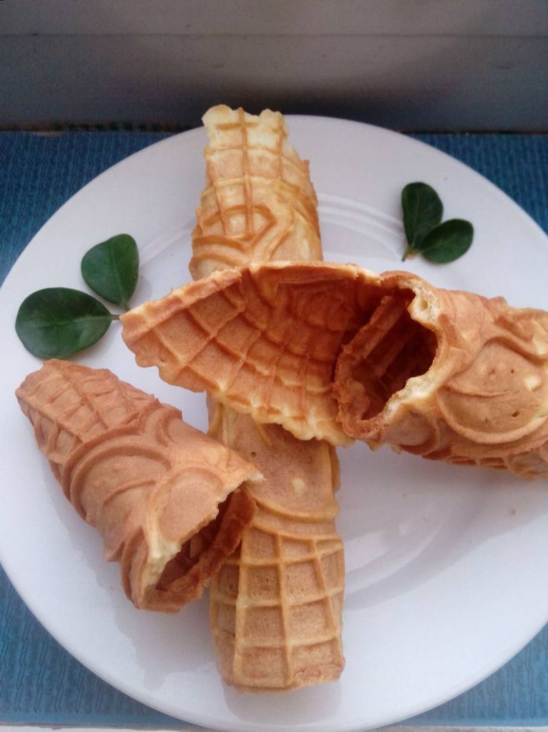 7:正反翻着烤一烤,一分钟不到打开模具,哇出炉了,套上手套,快速卷起,不然会烫手的噢!