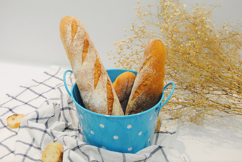 24:先倒入一杯热水入烤盘放在石板底下,一分钟后再倒入半杯热水,把发酵好的法棍胚放上石板上,230度烤制10分钟后,取出烤盘,继续200度烤制15分钟即可,如果过程上色好了的话加盖锡纸