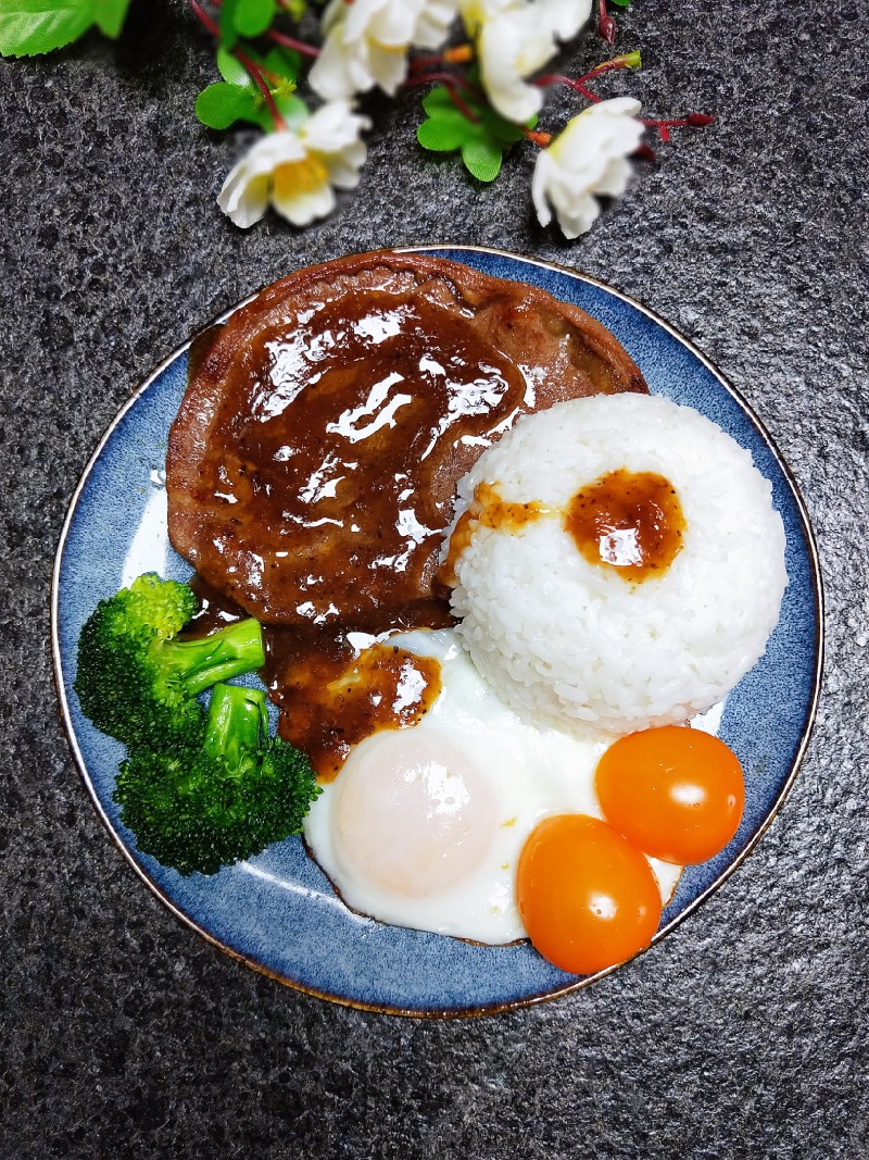 1:准备所有食材:米饭、牛排、鸡蛋、西兰花、小番茄、黑椒汁。