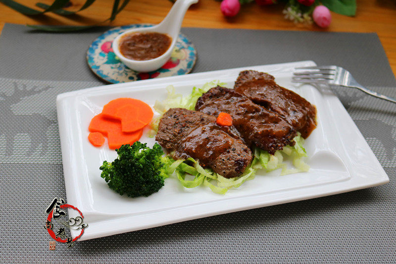 6:最后做黑椒汁,热油放入黑椒汁,水淀粉(即水加1匙淀粉)大火收汁完成。