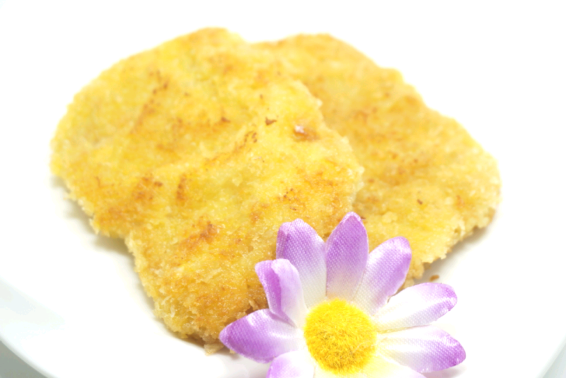 5:把猪扒按淀粉-蛋液-面包糖的顺序依次裹好,放在盘子中静置十分钟。