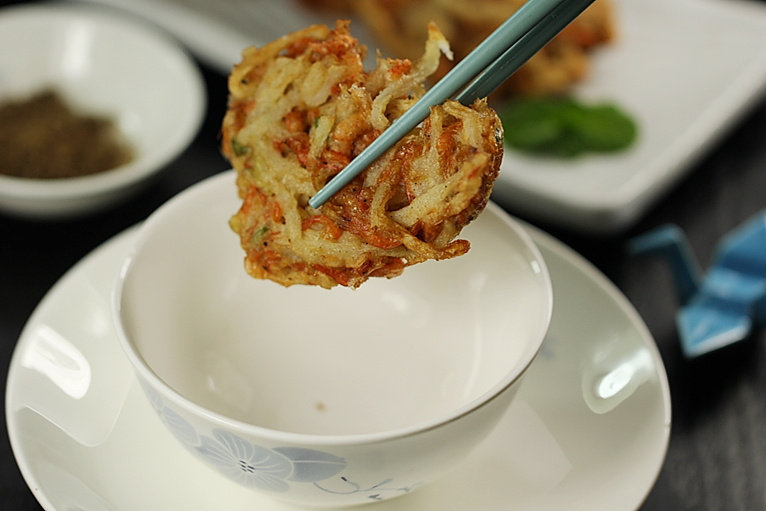 1.有人不喜欢白萝卜的味道,所以提前焯水,焯过后的白萝卜丝须挤干水分;2.萝卜丝和河虾放入碗中,加入少许面粉以便萝卜丝饼定型;加入鸡蛋和其他调味料混合好馅料;3.我用湖北的面窝模具中炸至定型,亲可以自己随意找利于定型的模具。