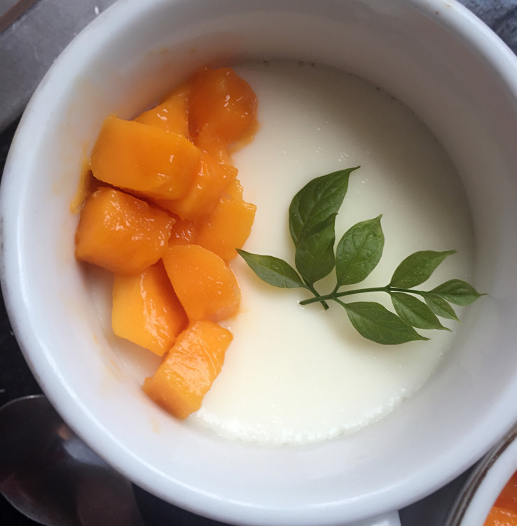 8:双皮奶已经凝固了,将芒果盛入双皮奶表面即可享用了。