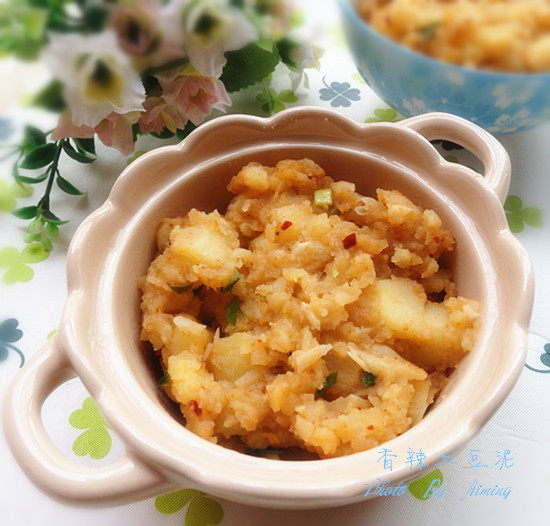 3:土豆蒸好用勺子捻碎,油下锅8分熟放盐,香葱,胡椒粉,辣椒面,看个人爱好不想吃的吧胡椒粉辣椒面去掉,炒出葱香味关火,