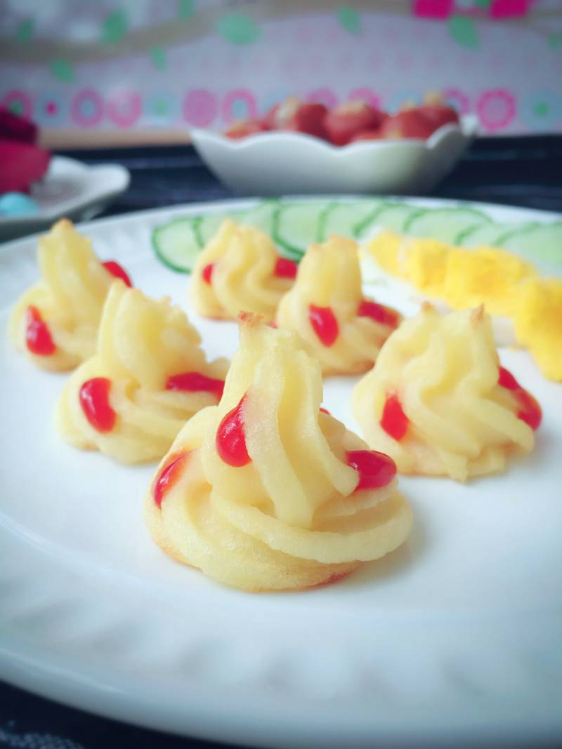 8:将所有的土豆泥装好盘,将番茄酱或是蓝莓酱点在土豆泥球上,装饰。