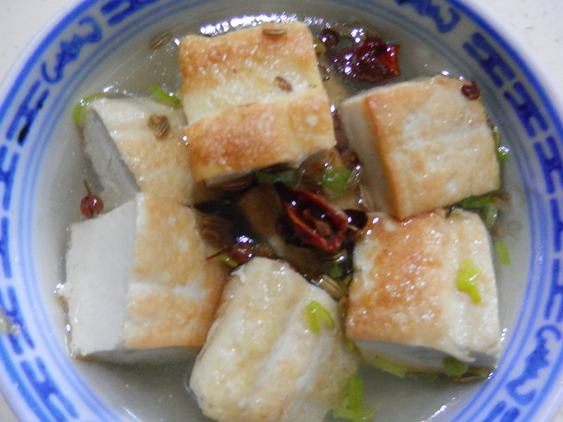 4:另一锅上火,加入适量清水,放葱碎、花椒、八角、小茴香、盐煮开,放入煎好的豆腐,水再开即好